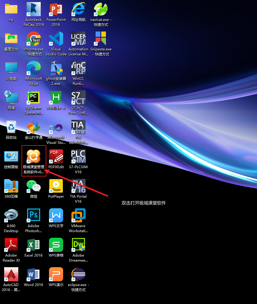 1、进入上课模式,教师机桌面上找到极域客户端,双击打开。