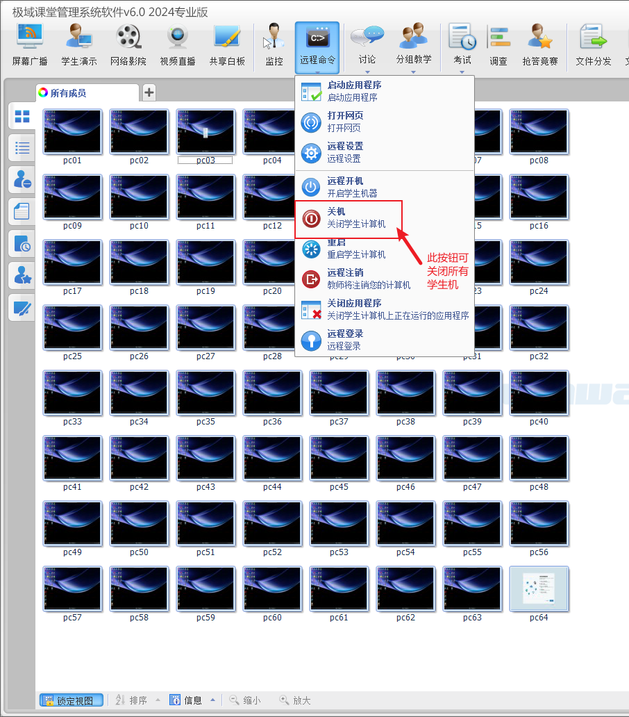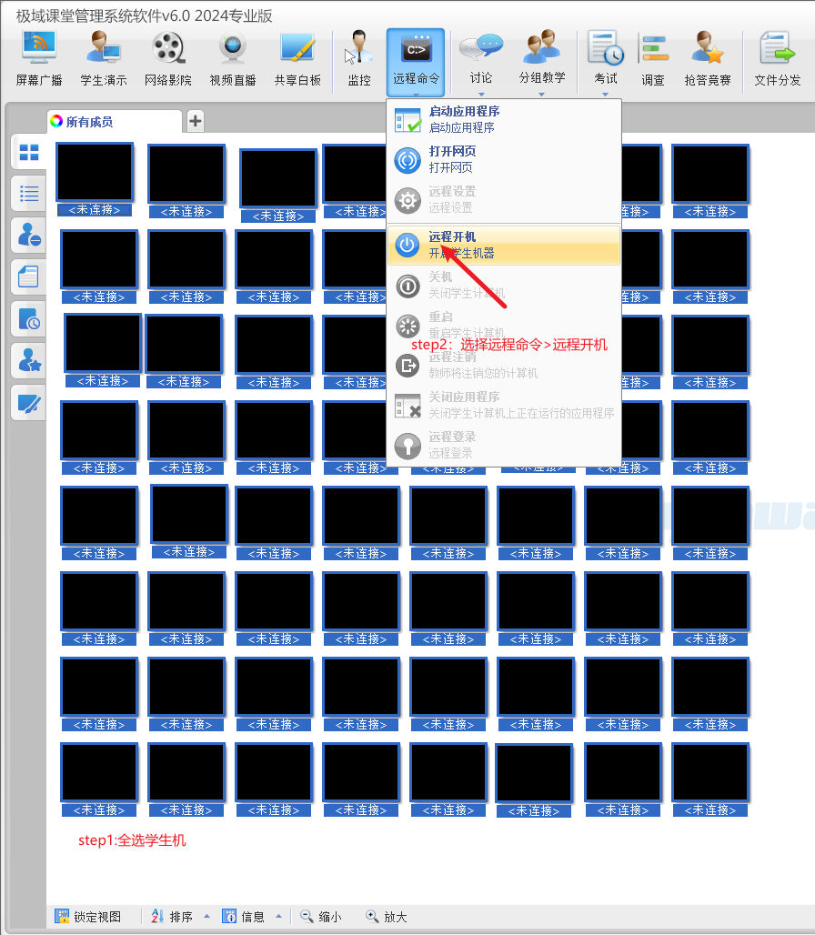 2、全选学生机,选择远程命令>远程开机,即可令所有学生机开机。