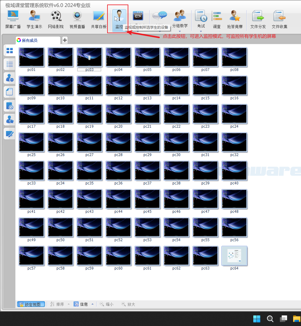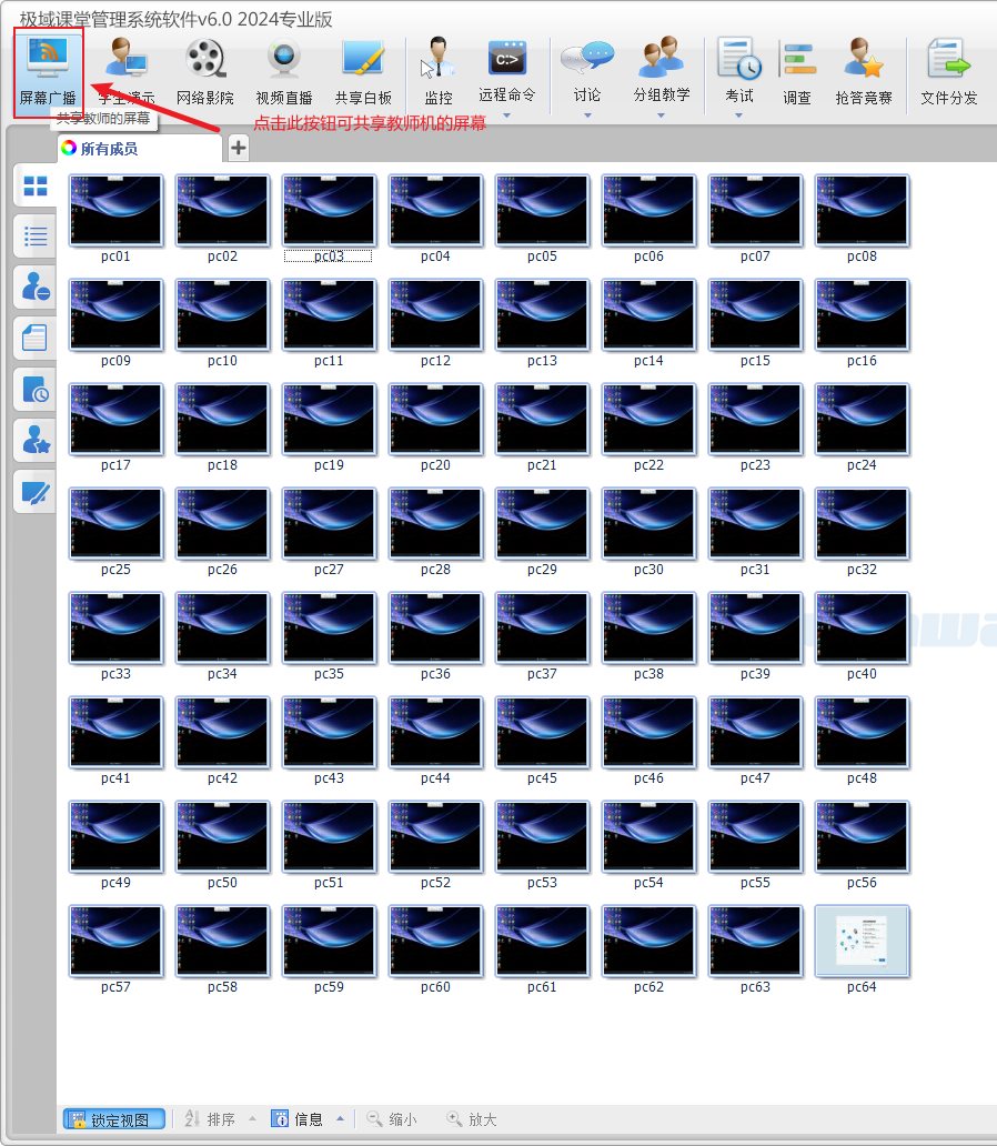 5、屏幕广播,可实现学生机屏幕同步显示教师机桌面显示内容。