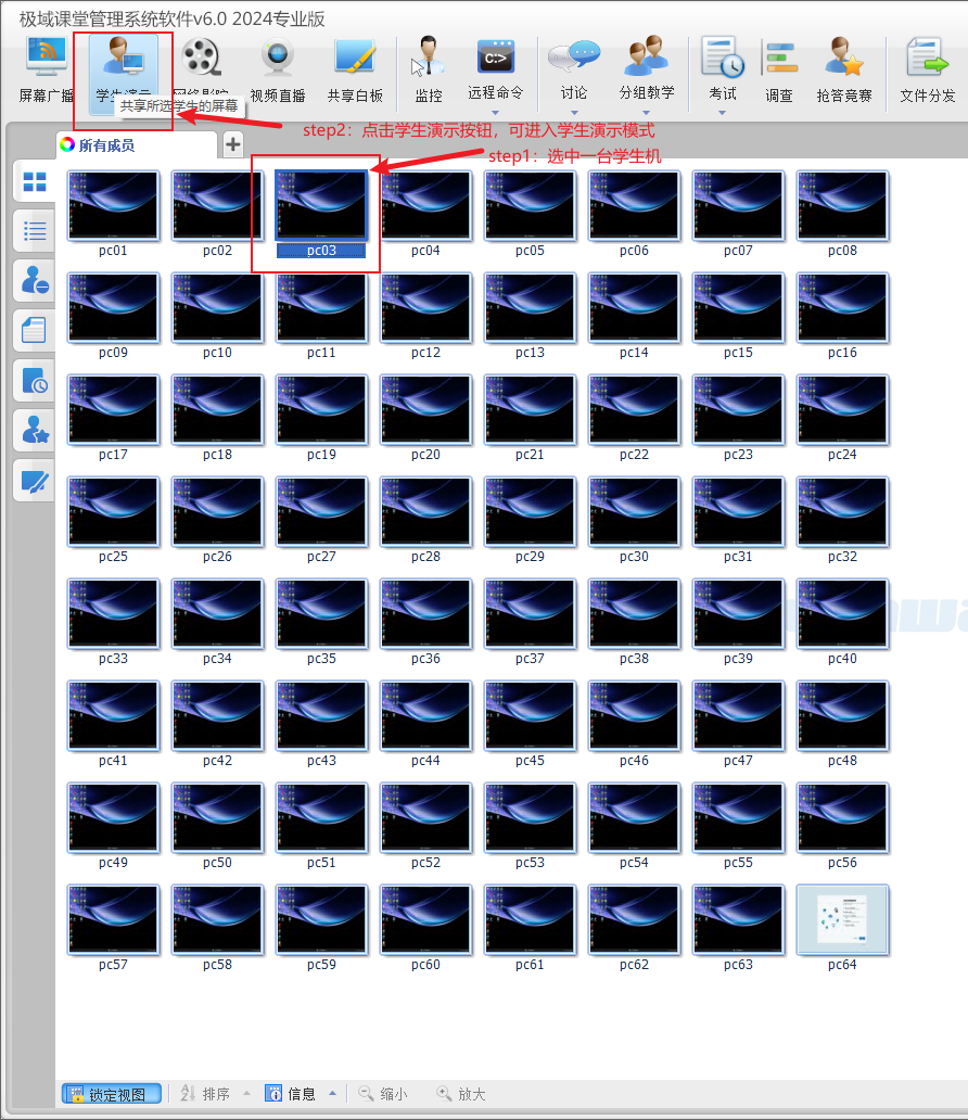 6、学生机演示功能,选中一台学生机远程控制并操作学生机。可配合屏幕广播使用。